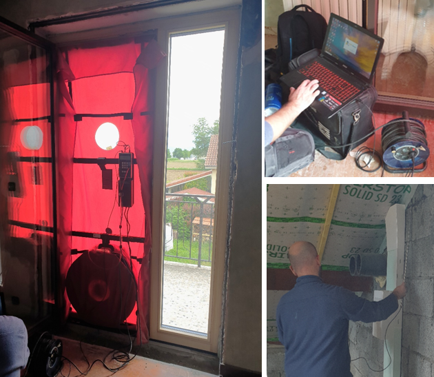 Le système de porte « soufflante » est placé dans une ouverture, en général à la place de la porte d’entrée. Les bouches de ventilation sont obturées afin de ne prendre en compte que les défauts d’étanchéité.