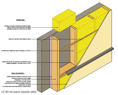 L’isolation des 4 pignons des immeubles en paille vient d'être achevée. Les bottes de pailles, de 22 cm d'épaisseur, ont été livrées déjà calibrées et dépoussiérées. Elles ont été recouvertes d'un enduit chaux sable épais de 3 centimètres. Les façades nord et sud, quant à elles, sont isolées en laine de bois et laine de roche.